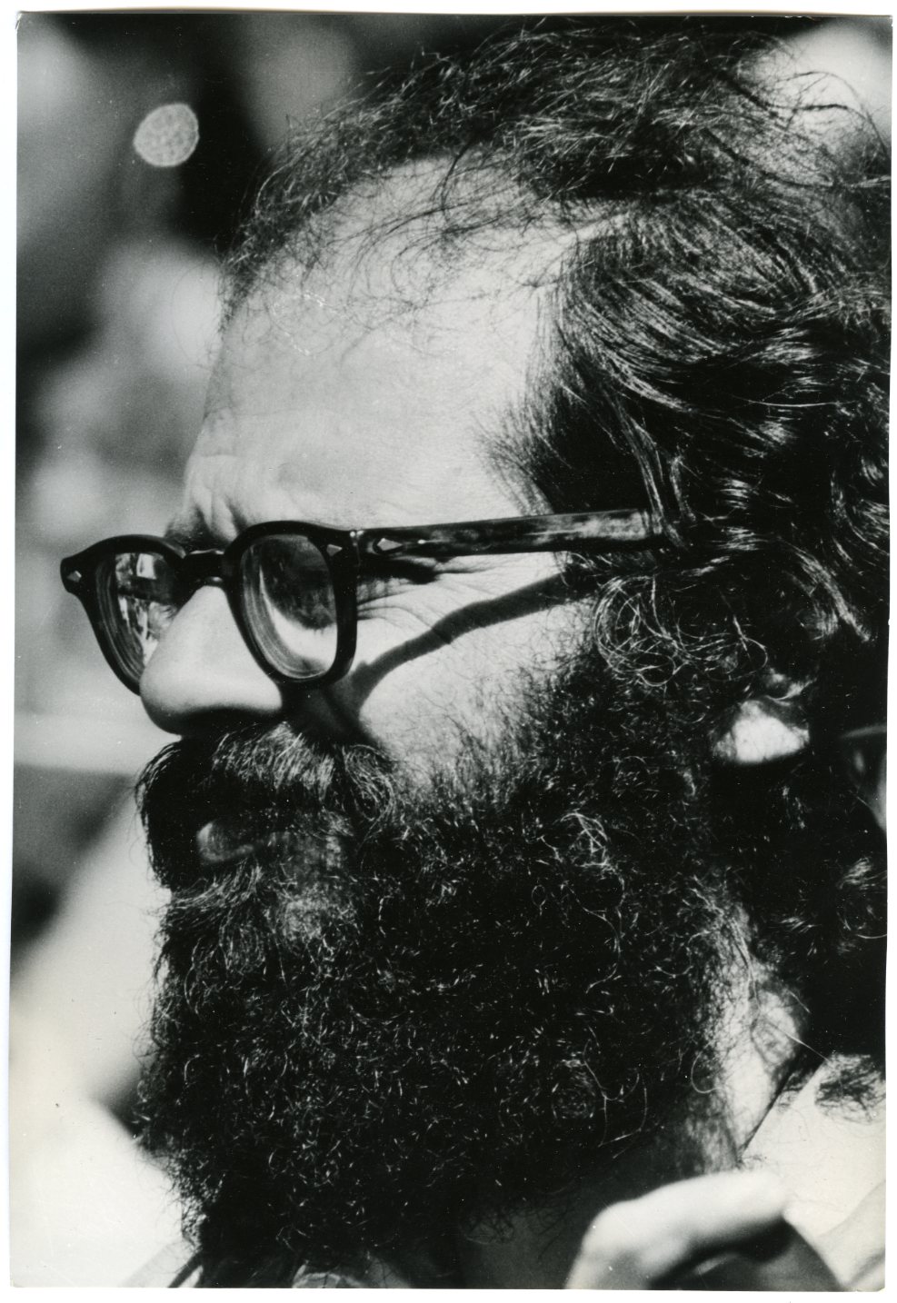 Portrait d’Allen Ginsberg (1926-1997) en 1966. Tirage argentique d’époque, 23,8 x 16,2 cm. Au dos, timbre humide (apposé deux fois) du photographe et indication manuscrite : « Le poète beatnik Allen Ginsberg ».