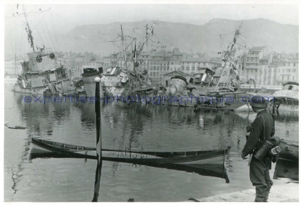 ![]() | Toulon, sabordage de la flotte, 1940 - Cinq épreuvesAnonymeToulon, sabordage de la flotte, 1940. Cinq tirages argentiques dâépoque dâenviron 13,2 x 9 cm. Au dos de chaque épreuve, timbre humide : « Nur für den Dienstgebrauch ! » (uniquement pour usage interne). Dimensions : 13,2 x 9 cm. 320 euros. Référence 141 Retour à la galerie |