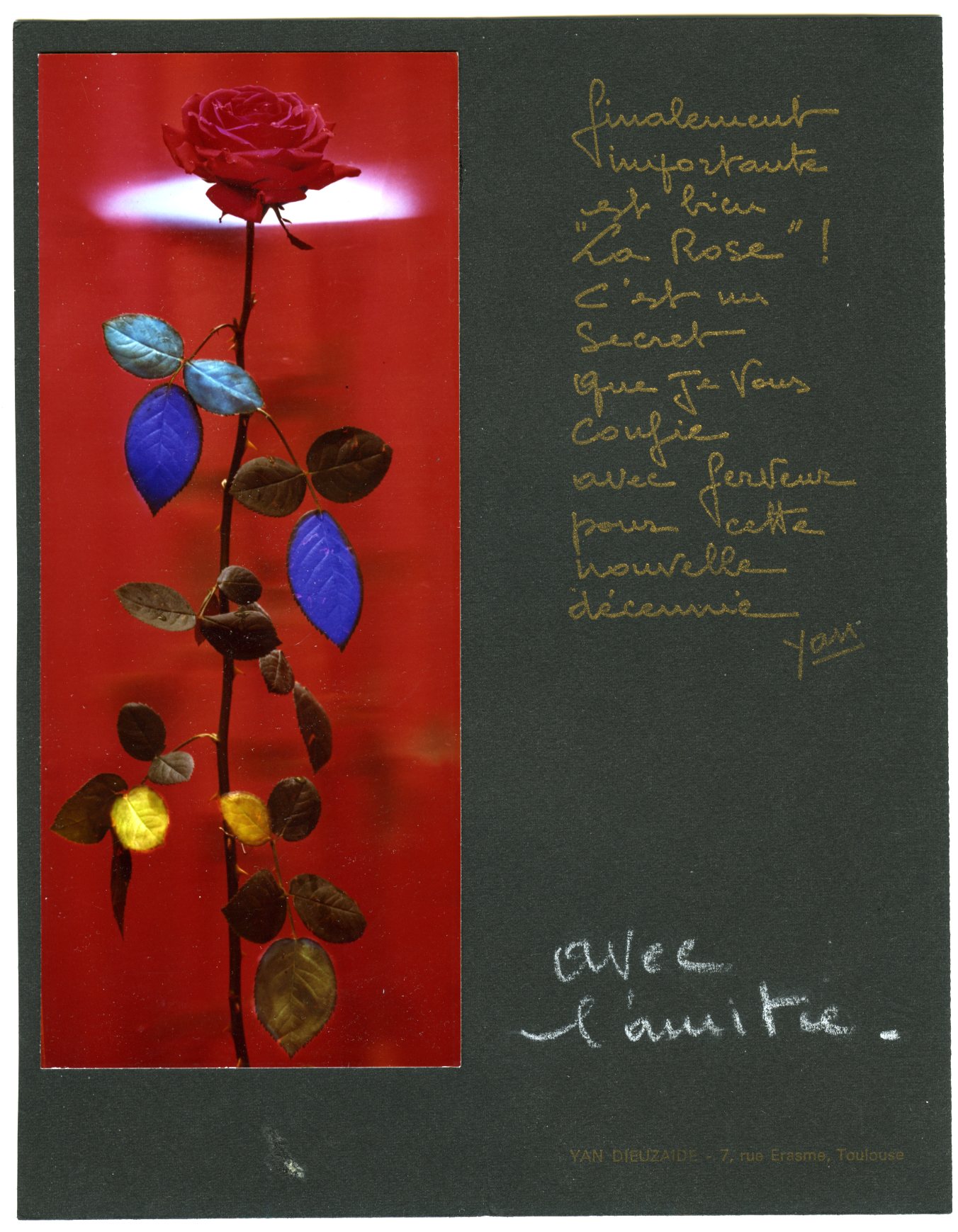 ![]() | Carte de vÅux photographiques,1969YAN (1921-2003) [Jean Dieuzaide, dit]Une rose, 1969. Tirage argentique couleurs dâépoque, 18,1 x 7,4 cm, collé sur une feuille à dessin imprimée au nom du photographe : « Yan Dieuzaide â 7, rue Erasme, Toulouse ». Sur la feuille à dessin un texte de la main du photographe : « Finalement importante est bien « La Rose » câest un secret que je vous confie avec ferveur pour cette nouvelle décennie. Yan avec lâamitié ». Au dos du carton, la date manuscrite : « 1970 ». Il sâagit ici dans la plus pure tradition des photographes français dâune carte de vÅux photographique pour la nouvelle année 1970. Dimensions : 18,1 x 7,4 cm. 360 euros. Référence 150 Retour à la galerie |