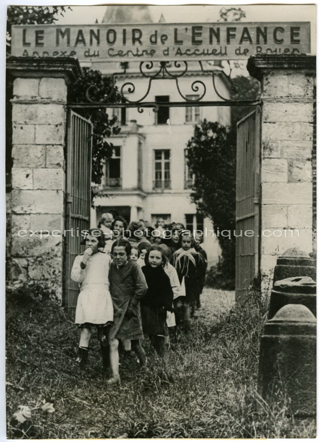 Enfants au manoir de Tourville-la-Rivière, vers 1942. Tirage argentique d'époque, 18,3 x 13,1 cm. Au dos, timbre humide de l'agence Trampus portant le visa de censure et timbre humide : "Radio-Nationale / Service documentation". Étiquette de légende dactylographiée :