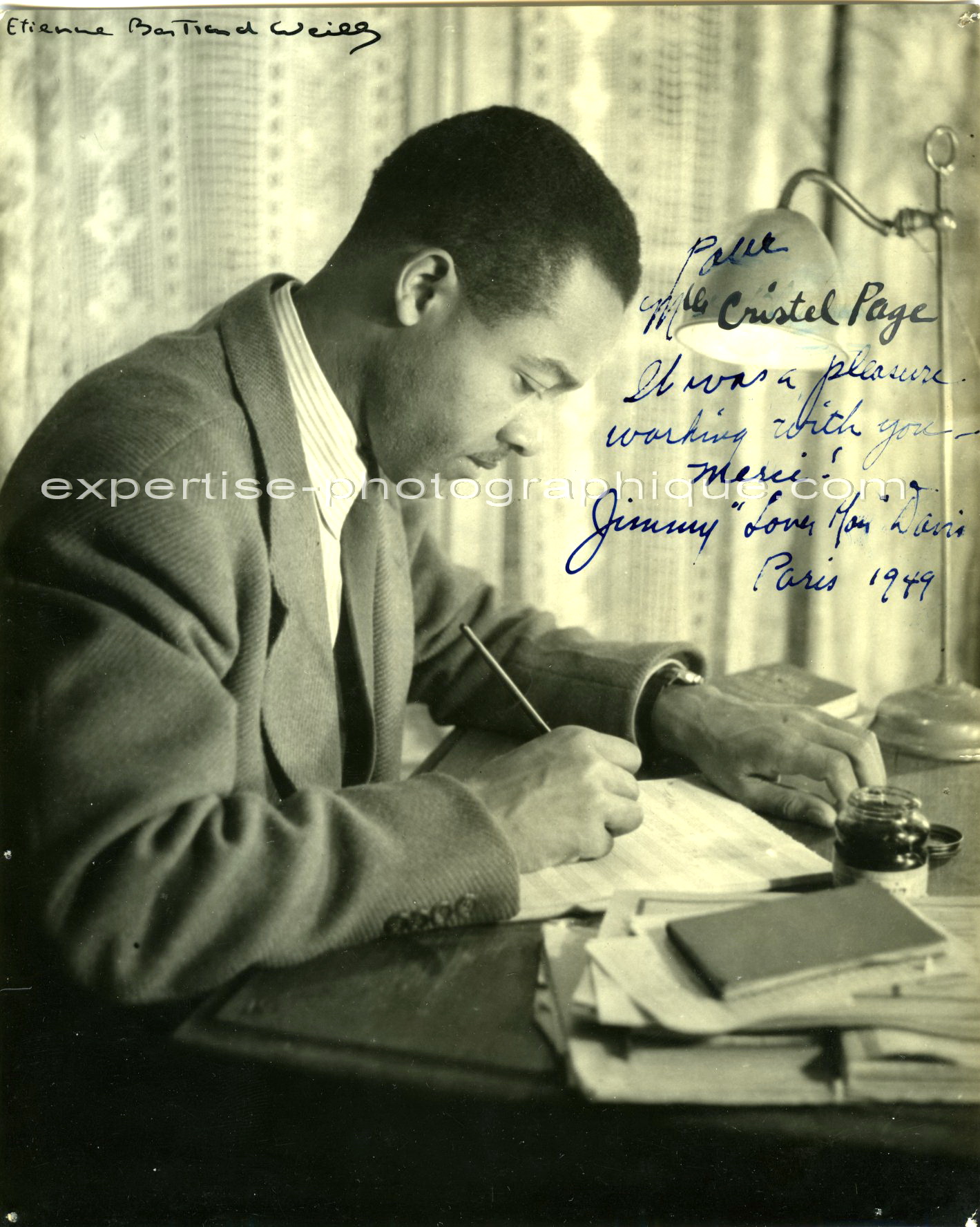 ![]() | Le musicien Jimmy Davis, 1949Etienne Bertrand WEILL (1919-2001)Le musicien Jimmy Davis, 1949. Tirage argentique dâépoque, 22,4 x 18 cm. Sur lâimage, signature dâEtienne Bertrand Weill, dédicace de Jimmy Davis à Cristel Page : « It was a pleasure working with you. Merci ! Jimmy âLover manâ Davis Paris, 1949». Au dos, timbre humide dâÃtienne Bertrand Weill. Jimmy Davis (1915-1997) était un compositeur, chanteur, pianiste et acteur américain qui vécut à Paris à partir de 1947. Dimensions : 22,4 x 18 cm. 560 euros. Référence 186 Retour à la galerie |
