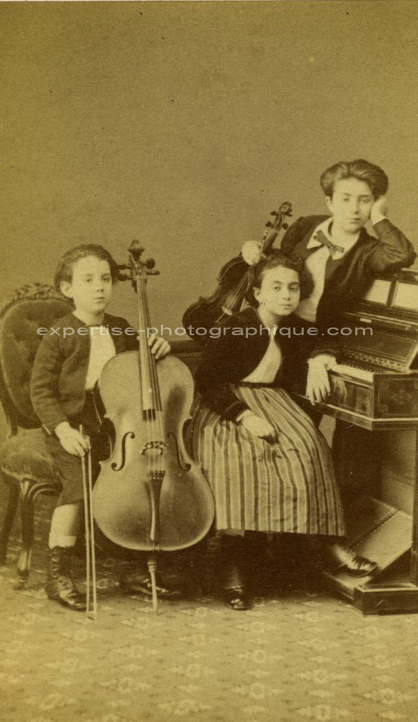 Il s'agit d'une photographie dite "Carte-de-visite". Le clavier présent à l'image est, non un piano, mais un harmonium.