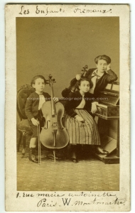 Enfants musiciens, vers 1860. Tirage albuminé d'époque, 8,8 x 5,1 cm, collé sur un carton imprimé du nom du photographe.Sur la carton inscriptions manuscrites : "Les enfants Frémaux, 8 rue Marie-Antoinette Paris Montmartre".