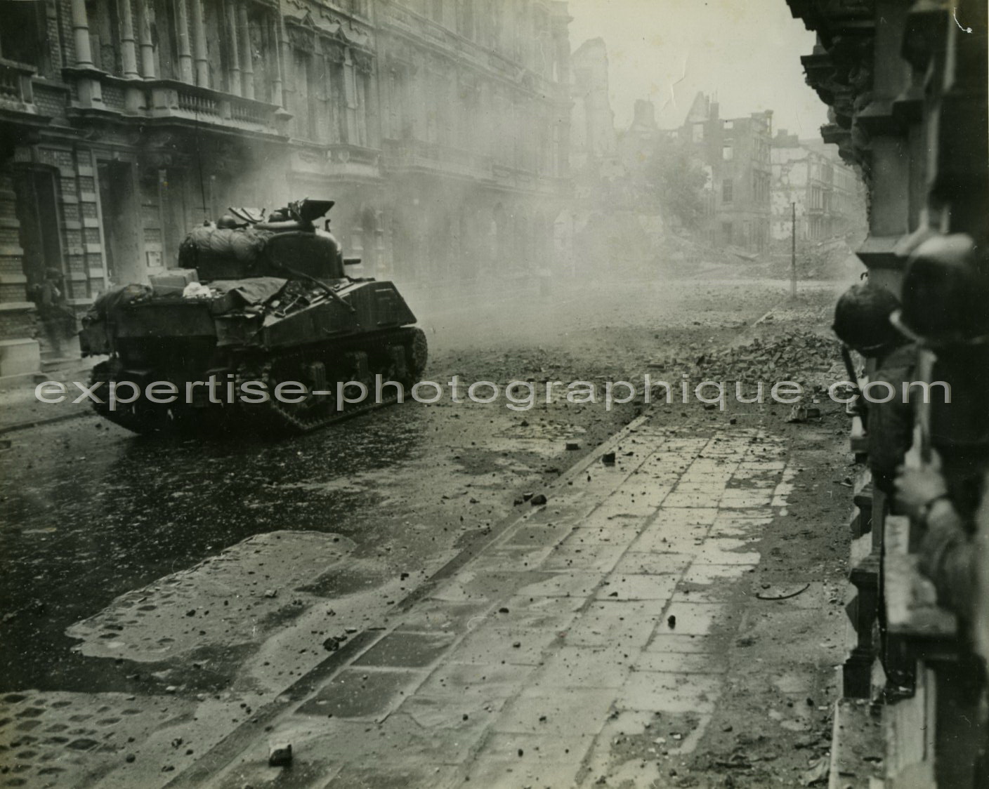 | Photographe anonyme pour l'armée américaine Char et soldats américains dans un combat de rue à Aachen (Allemagne), le 16 octobre 1944. Tirage argentique d'époque, 19,3 x 23,9 cm sur papier photographique 20,7 x 25,4 cm. Au dos, légende dactylographiée (en anglais)de l'U.S. Signal Corps. Dimensions : 19,3 x 23,9 cm. 220 euros. Référence 229 Retour à la galerie |